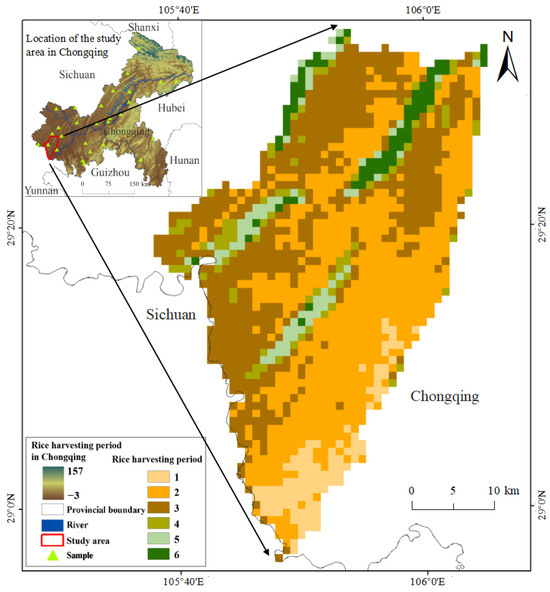 where x1 is the latitude, x2 is the altitude, and y is a value between the pre-harvest and post-harvest period of the rice fields. Substituting the altitude and latitude of a specific location into Equation (7) yields Y = 1, determining the rice harvest period for that location. Subsequently, the harvesting period range was simulated across the entire study area (see Figure 5). Figure 5 shows that the top left corner illustrates the range of the simulated rice harvest period in Chongqing. The range from −3 to 157 represents the harvest time, where Y = 1 indicates that the rice is harvested around August 1st, and so on. Since the distribution of rice was not known during the simulation of the harvest period, the simulation covers the entire area. Practical considerations revealed that regions classified as 7, 8, and 9—characterized by high elevations and forest cover—were unsuitable for rice cultivation. Therefore, these areas’ indicated harvesting periods were deemed impractical. However, this did not affect the subsequent extraction of rice fields because the core basis for rice extraction in this study was the change in NDVI values before and after the rice harvest. Therefore, even if certain areas that did not cultivate rice were simulated with a harvest period, they were not misclassified during extraction since the NDVI values in those areas did not exhibit the same changes as those in rice fields. For consistency in subsequent research, they were grouped into the 6th category, establishing the rice harvesting period in the study area from 31 July to 29 August. Figure 5 illustrates earlier rice harvesting in the southern region (first harvest zone category), contrasting with delayed harvesting in the northwestern region (categories 3 to 6). Additionally, the southeastern region predominantly falls into the second category, representing the largest harvested area during this period.