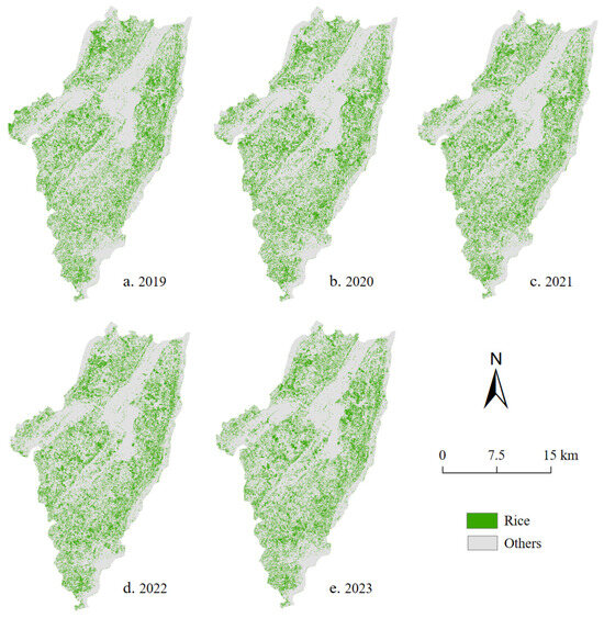 Rice fields extraction results from 2019 to 2023.