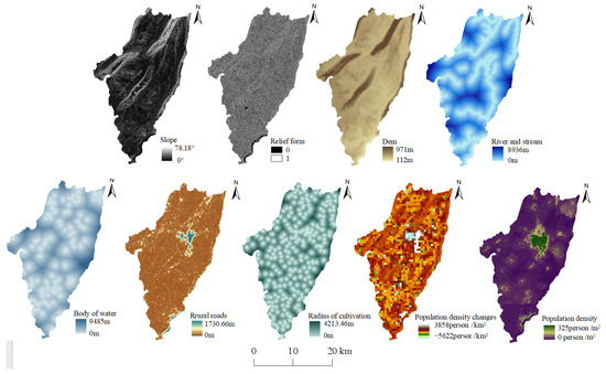 Then, the independent variables were extracted, including slope, terrain morphology, and elevation, which were all based on DEM data extraction. The slope was obtained using surface analysis tools. Terrain morphology is classified into positive and negative forms. Positive forms refer to terrain that rises relative to neighboring areas or newly uplifted regions, while negative forms refer to terrain that sinks relative to neighboring areas or newly subsiding regions [42]. The specific method involved analyzing the neighborhood to obtain the average elevation of the neighboring areas in the DEM. Then, using the raster calculator, the difference between the value of the area itself and its neighboring areas was calculated. If the difference was positive, it indicated positive terrain, while if it was negative, it indicated negative terrain. The rivers and rural roads were regarded as linear features and were analyzed using Euclidean distance; The water bodies were considered as polygon features and were converted into point features. Then, Euclidean distance analysis was conducted separately. Among these, the distance between residential settlements and rice fields represented the cultivation radius. As for the population density in the driving factors, LandScan and WorldPop are commonly used global population datasets. The LandScan dataset has a resolution of 1000 m × 1000 m and was updated until 2022, while the WorldPop dataset has a resolution of 100 m × 100 m and was updated until 2020. There are differences in both time and resolution between the two datasets, and in subsequent studies, all data need to be standardized to the same spatial resolution. Choosing different population datasets will result in different spatial scales involved in the subsequent analysis, leading to different suitability. Therefore, it was necessary to investigate separately and select the population dataset that had the best fit. For the LandScan dataset, population density change was used as the driving variable by subtracting the population density data of 2022 from that of 2019; As for the WorldPop dataset, population density was used as the driving variable based on the data from 2020.
