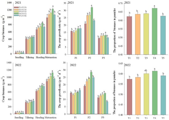 Straw returning significantly increased the crop biomass of rice at the heading and maturation stages but decreased it at the tillering stage. Increasing the N fertilizer ratio at the tillering stage with straw returning increased the crop growth rate across the rice growing season, thus increasing the total crop biomass accumulation. Among these, the crop biomass increased mostly in T4 treatment (with N applied in the proportion of 5:4:1, respectively, in basal:tillering:panicle phases), which significantly (p < 0.05) increased by 14.14%, 19.52%, and 15.71%, respectively, compared with that of T2 (with N applied in the proportion of 5:2:3, respectively, in basal:tillering:panicle phases). Additionally, increasing N fertilizer ratio at the tillering stage with straw returning promoted the crop biomass translocation to panicles. The proportion of crop biomass in panicles of T4 (5:4:1) treatment was significantly increased by 5.35% (p < 0.05), on average, compared with that of T2 (5:2:3) (Figure 1). These results suggest that an insufficient supply of nitrogen at the tillering stage may adversely affect the rice shoot establishment and function, thus decreasing the carbon assimilation and translocation processes.