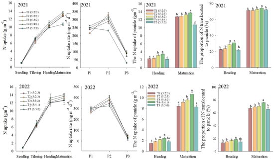Effects of increasing N fertilizer ratio at tillering stage on the rice N uptake and translocation of rice. Note: T1 (5:2:3), no straw returning with the N fertilizer ratio of basal:tillering:panicle = 5:2:3 treatment. T2 (5:2:3), straw returning with four different N fertilizer ratios of basal:tillering:panicle = 5:2:3 treatment. T3 (5:3:2), straw returning with four different N fertilizer ratios of basal:tillering:panicle = 5:3:2 treatment. T4 (5:4:1), straw returning with four different N fertilizer ratios of basal:tillering:panicle = 5:4:1 treatment. T5 (5:5:0), straw returning with four different N fertilizer ratios of basal:tillering:panicle = 5:5:0 treatment. P1: The periods during the seedling to tillering stage. P2: The periods during the tillering to heading stage. P3: The periods during the heading to maturation stage. Values followed by a different small letter are significantly different at 5% probability level.