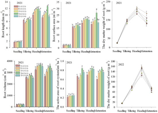 Effects of increasing N fertilizer ratio at the tillering stage on rice root characteristics. Note: T1 (5:2:3), no straw returning with the N fertilizer ratio of basal:tillering:panicle = 5:2:3 treatment. T2 (5:2:3), straw returning with four different N fertilizer ratios of basal:tillering:panicle = 5:2:3 treatment. T3 (5:3:2), straw returning with four different N fertilizer ratios of basal:tillering:panicle = 5:3:2 treatment. T4 (5:4:1), straw returning with four different N fertilizer ratios of basal:tillering:panicle = 5:4:1 treatment. T5 (5:5:0), straw returning with four different N fertilizer ratios of basal:tillering:panicle = 5:5:0 treatment. Values followed by a different small letter are significantly different at the 5% probability level.