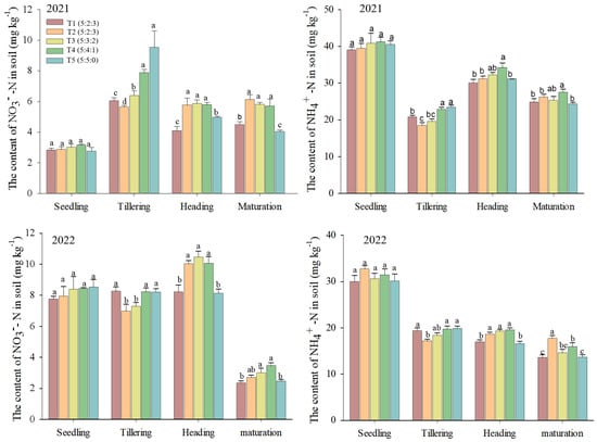 Straw returning significantly decreased the content of soil ammonium and nitrate N at the rice tillering stage. For example, the content of ammonium and nitrate N at the tillering stage in T2 (5:2:3) treatment of 2021 and 2022 decreased on average by 11.25% and 11.16% (p < 0.05), compared with that of T1 (5:2:3). This may because the microorganisms competed for the available N in the soil to decompose straw. Increasing the N fertilizer ratio at the tillering stage could not only increase the soil N content at the tillering stage but also maintain a relatively high level at the later growth stages. Among these, the content of soil ammonium and nitrate N in T4 (5:4:1) treatments increased the most, which were 19.29% and 28.91% (p < 0.05) higher at the rice tillering stage, respectively, compared with that of T2 (5:2:3) treatment (Figure 4).