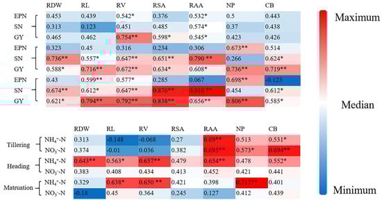 Person correlation analysis. Note: * Significant at the 0.05 probability level. ** Significant at the 0.01 probability level; RDW: root dry matter weight, RL: root length, RV: root volume, RSA: root surface area, RAA: root active area, NP: nitrogen uptake, CB: crop biomass; EPN: effective panicle number, SN: spikelet number, GY: rice grain yield.