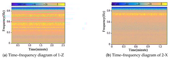 To further analyze the energy distributions of the vibration signals at the 1-Z, 2-X, 3-Y, and 4-Z measurement points over the whole time course, the time–frequency characteristics of the vibration energy with time and frequency after the data are transformed via short-time Fourier transform, as shown in Figure 40. The vibration energy of 1-Z and 2-X has a high-frequency interference signal but the vibration energy of the other measurement points is concentrated at the low-frequency operating frequency.