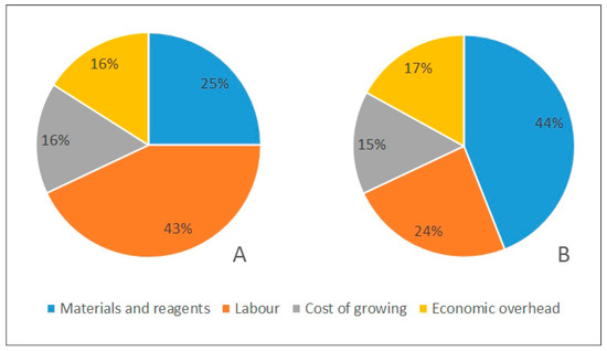 Taking into account the cost structure of using agar cultures, the largest share is labour costs (43%). Next, with a large share constituting 25% of all costs, are the costs of materials and reagents. However, growth costs and other overhead costs account for 16% each (Figure 2A).