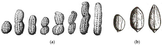 Physical characteristics of peanut pods and kernels. (a) From left to right, single-grain shape, normal shape, axe shape, gourd shape, bee-waist shape, cocoon shape, hockey-stick shape, and beaded shape; (b) From left to right, round, cylindrical, and oblong. Reprinted with permission from ref. [26]. Copyright Jiangsu Academy of Agricultural Sciences.