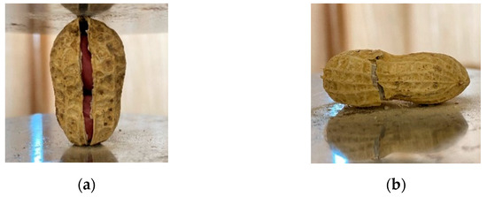 Gao, Xuemei et al. [27] pointed out that the peanut geometrical dimensions affecting the parameters of the components are mainly the width and thickness of the pods and seeds. Xu Hongmei et al. [28] found that under the action of loads in different directions, peanut pods exhibit two forms of shell rupture: longitudinal rupture and transverse rupture (Figure 2). Longitudinal rupture generally occurs at the bonding edge of the two sides of the pod shell, and transverse rupture tends to occur at the thinnest part of the shell at the loading point of the cross-section firstly, and then cracks outward along the webbing of the pods.
