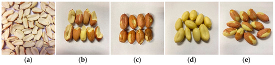 Characteristics of mechanical shelling damage of peanut kernels. (a) Broken and half-grained; (b) Severely damaged kernels; (c) Slightly damaged kernels; (d) Complete seed coat shedding; (e) Partial seed coat shedding.