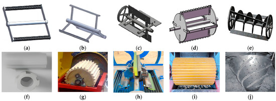 Various types of shelling cylinders. (a) Threaded rods—hitting cylinder; (b) Flat Steel rods—hitting cylinder; (c) Iron plates—hitting cylinder; (d) Edge plates—cutting cylinder; (e) Iron spiral cylinder; (f) Nylon sleeve rods—hitting cylinder; (g) Wooden cylinder; (h) Polyurethane plate—hitting cylinder; (i) Polyurethane cylinder; (j) Iron taper cylinder.