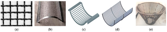 Various types of sieves. (a) Woven flat sieve; (b) Perforated concave sieve; (c) Grid concave sieve; (d) Grid concave sieve with stiffeners; (e) Conical sieve.