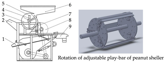 Gao et al. [61] optimized the striking and kneading peanut-shelling equipment by designing the shelling cylinder as an adjustable rotating play-bar mechanism, which can change the play-bar type and number, and change the spacing of the shelling cylinder-concave sieve grouping, as shown in Figure 6. Peanuts were shelled under the high-speed striking and kneading of the play-bar between the cylinder and concave sieve. The adjustable mechanism improves the adaptability of the machine to peanut varieties, but the all-metal shelling cylinder increases kernel breakage to some extent. The machine performed best when shelling BaiSha peanuts with 11.87% moisture content.