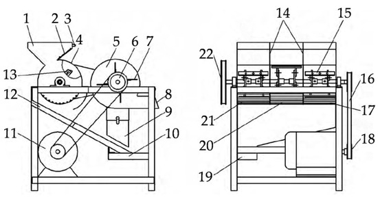 Structure diagram of peanut sheller with three drums for plot breeding. Reprinted with permission from ref. [62]. Copyright 2016 Shenyang Agricultural University. Key: 1—feeding hopper; 2—feed adjustment plate; 3—handle; 4—chassis; 5—fan; 6—fan pulleys; 7—fan blades; 8—fan outlet; 9—fan suction port; 10—rack; 11—electric motor; 12—lower slide plate; 13—hulling drum; 14—partition; 15—hulling and playing; 16—transmission belt; 17—concave screen I; 18—motor pulleys; 19—outlet; 20—concave screen II; 21—concave plate sieve III; 22—hulling drum with wheels.