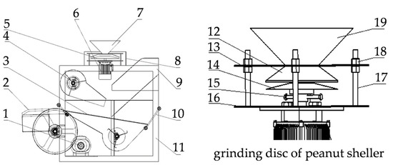 Structural form diagram of grinding disc groundnut sheller. Reprinted with permission from ref. [63]. Copyright 2020 Hebei Agricultural University. Key: 1—motor 1; 2—outlet hopper; 3—vibrating screen; 4—fan; 5—rotating grinding disc; 6—motor 2; 7—inlet and outlet; 8—baffle plate; 9—crushed shell outlet; 10—swing link; 11—frame; 12—upper cone; 13—support plate; 14—lower cone; 15—coupling; 16—support plate for shelling; 17—bolt rod; 18—block nut; 19—feeding hopper.