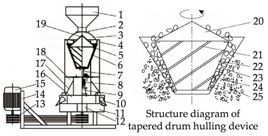 Structure diagrams of peanut sheller with vertical tapered drum. Reprinted with permission from ref. [64]. Copyright 2019 Shenyang Agricultural University. Key: 1—feeding hopper; 2—flow regulation plate; 3—upper cover; 4—gap adjustment connecting disc; 5—conical grid sieve; 6—cone roller; 7—output shaft; 8—coupling; 9—reducer; 10—output mouth; 11—fan box; 12—discharge port; 13—transmission belt; 14—racks; 15—motor; 16—segregated bin; 17—deflector plate; 18—aggregate silo; 19—evenly distributed manifold; 20—evenly distributed cone; 21—hulling rib strip; 22—cone roller; 23—cone sieve; 24—peanut pods; 25—extrusion.