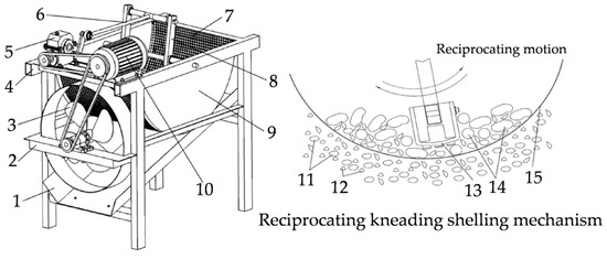 Structural form diagram of reciprocating kneading peanut-shelling equipment. Reprinted with permission from ref. [65]. Copyright 2024 Henan Academy of Agricultural Sciences. Key: 1—discharge port; 2—fan bracket; 3—fan; 4—rack; 5—reducer; 6—connecting rod; 7—woven screen; 8—kneading mechanism; 9—side bezel; 10—adjustable-speed motor; 11—nuts; 12—broken shells; 13—polka dot rubber; 14—peanuts to be shelled; 15—woven screen.