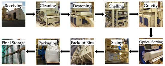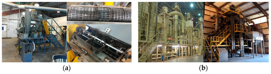 Peanut-shelling factory and equipment in USA. (a) Peanut-shelling plant; (b) Bagged peanuts await shipping; (c) Precision peanut shelling equipment installed in Texas. Reprinted with permission from ref. [92]. Copyright 2021 Texas Peanut Board.