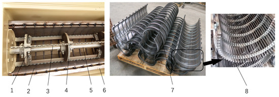 After years of development and market verification, the current U.S. commercial peanut-shelling equipment is dominated by LMC’s large-scale series shelling equipment, accounting for about 90% of its market share [88]. The shelling equipment is generally equipped with 4~5 shelling cylinders, whose core structure consists of three flanges clamping and fixing three rotating rods with corrugated edges at the outer end and a semi-circular concave sieve composed of “T”-shaped grid steel, the materials of which are all subjected to standard heat treatment (Figure 15). By setting the structural parameters of each shelling roller and concave plate sieve, parallel multi-stage shelling can improve shelling quality. Table 2 shows the information of some shelling equipment developed by LMC.