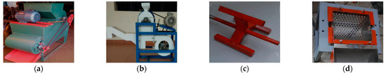 India widely cultivated peanuts in the second half of the 19th century [93], and has become the world’s first peanut planting area and second peanut production country. Peanut production exceeds 7 million tons, accounting for about 14% of the world’s output. India’s peanuts are mainly planted in western, southern, and eastern coastal areas, such as West Bengal, Gujarat, Andhra Pradesh, and Tamil Nadu [2]. Some achievements have also been made in research into mechanized peanut-shelling in India. Gojiya D.K. et al. [94] studied the physical and mechanical properties of peanut kernels. Mishra A. et al. [95] first developed a low-cost, manually operated pedal-powered peanut sheller. Nilesh B. [96] designed an economical peanut sheller suitable for agricultural use (Figure 18a). Darshan Gowda C.P. et al. [97] manufactured an electric peanut sheller and selected and designed its parts (Figure 18b). Ramachandra Raju K. et al. [98] developed a multi-functional peanut sheller with a built-in roaster. Prathamesh S.G. et al. [99] designed a peanut sheller suitable for seed production and small industry (Figure 18c,d).