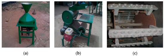Peanut-shelling machines in Nigeria. (a) Bambara groundnut sheller. Reprinted with permission from ref. [104]. Copyright 2016 IFRJ. (b) Modified native peanut sheller. Reprinted with permission from ref. [105]. Copyright 2019 BJET. (c) Peanut-shelling cylinder and screen after modifying. Reprinted with permission from ref. [106]. Copyright 2022 FJS.