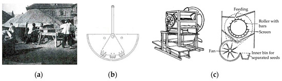 Mechanized peanut-shelling technology research in the United States started early and has a development history of more than 100 years. At the beginning of the 20th century, some simple wooden manual peanut-shelling equipment was introduced [71,72] and gradually matched with various power sources. By the late 1930s, dozens of manpower and power-operated peanut-shelling machines were invented [73,74,75,76,77,78,79,80,81,82,83], which gave birth to a variety of principles of peanut-shelling equipment and various structural forms of key shelling components [84]. Figure 11 shows the early peanut shelling equipment in the United States.