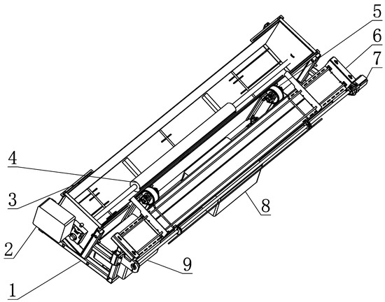 As shown in Figure 2, the shed rod-separation mechanism is an essential part of the automatic feeding system that enables single separation of shed rods. It consists of a seated slide bearing, revolving long shaft, separating rod and an ordinary DC motor. The trellis pole extrudes the distributed round bar under the influence of gravity as the round bar rotates under the motor’s drive. Each time the distributed round bar rotates, one trellis pole is removed from the feeding groove, allowing separation of the trellis poles by a single pole.