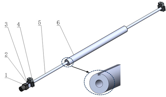 Schematic diagram of the trellis pole-separating mechanism. 1. Typical DC motor; 2. Motor mounting frame; 3. Joining; 4. Slide bearing in a seated position; 5. Extended rotating shaft; 6. Cutting a circular bar.