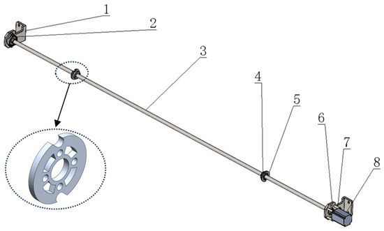 Diagrammatic representation of the casting rod mechanism’s structure. 1. Fixed support; 2. Bearing; 3. Pitching rod long shaft; 4. Fixed ring; 5. Pickup ring; 6. Coupling; 7. Support column; 8. Stepping motor.