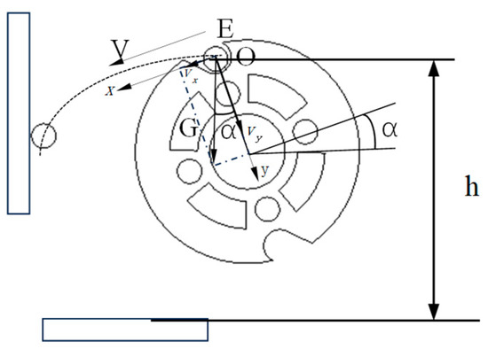 The shed rods create a collision force throughout the conveying and separating operations, which is mostly influenced by height and speed during separation [28,29]. When the ring is rotated to a predetermined position, the shed poles fall onto the trellis pole support plate under the force of gravity and wait for the rotary device to continue rotating to carry out the insertion operation. This process of rotating and conveying involves the pitching ring conveying the trellis poles to obtain the initial speed. The speed is along the direction of rotation of the pitching ring, and the magnitude of the speed is the same as the linear speed of the ring. The natural falling trajectory may be affected if the speed is too high, because it will result in a larger collision force with the shed pole-blocking member ahead. A mass point in the conveying process, as the shed pole approaches separation from the pitching rod ring, is considered as the subject of kinematic analysis, as illustrated in Figure 5.