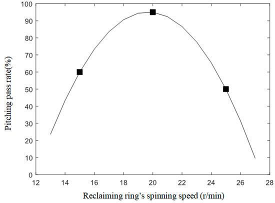 The automatic feeding device frame was parallel to the ground, and the rotational speed of the rod-throwing mechanism was divided into three levels of rod-throwing tests, and each group test was repeated three times, obtaining the average value to investigate the effect of the rotational speed of the rod-throwing mechanism on the qualified rate of rod throwing. The effect of the pitching rod mechanism on the pitching rod pass rate curve at various speeds is shown in Figure 6.
