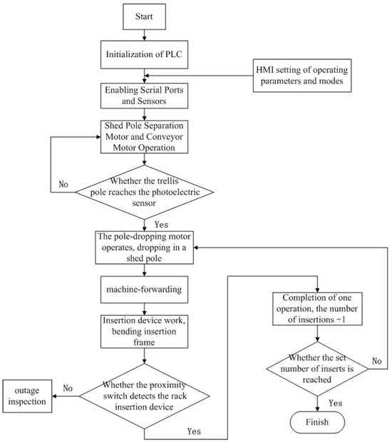 The design consisted of proximity sensors, photoelectric sensors (Siemens S7-200CPU224, manufactured by Siemens AG, headquartered in Munich, Germany), the feeding system and the control system of the automatic feeding device for small-arch functions. In Figure 7, the overall control flow is displayed.