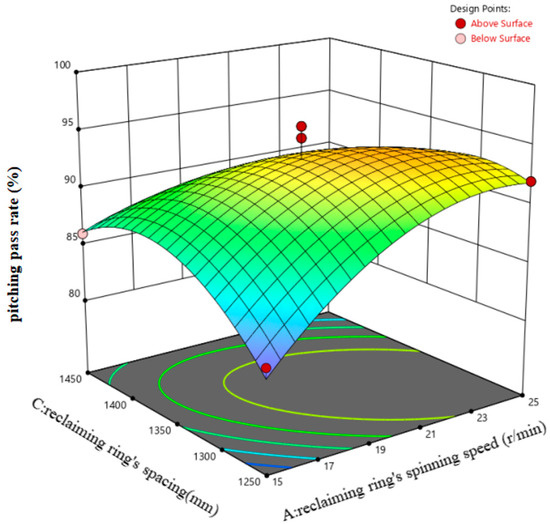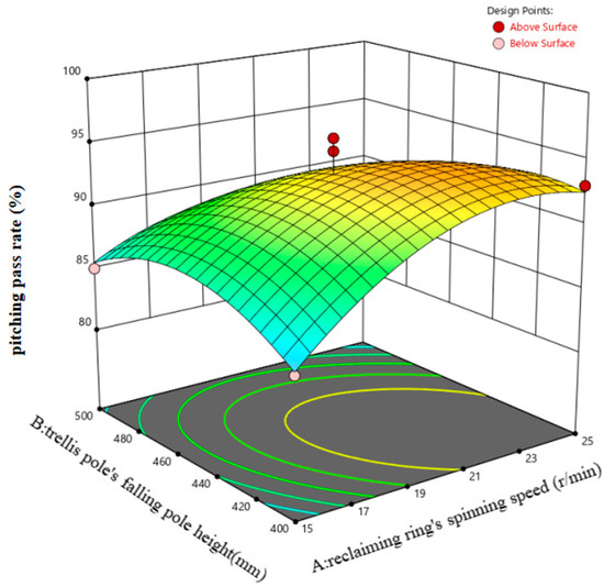 Figure 11 displays the response surface curves of the pitching pass rate interaction between the reclaiming ring’s spacing and the trellis pole’s falling pole height. The reclaiming ring’s spinning speed is at the center level (20 r/min). The optimal range for the height of the shed pole falling rod is 400–450 mm. When the pick-up ring spacing is established at a given level, the qualified rate of the pitching rod with an increase in the height of the shed pole falling rod initially displays a rising and then decreasing pattern. The qualifying rate of the scaffolding with an increase in the pick-up card ring spacing first exhibits a rising and then dropping trend, with the rate of decline being faster than the rise, when the height of the shed pole falling rod is set at a given level. Consequently, 1250–1380 mm is the optimal range for the pick-up card ring’s pitch.