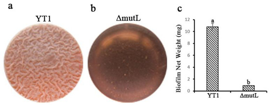Through biofilm phenotype testing and bioinformatic analysis of a random insertion mutant library of WT B. amyloliquefaciens YT1, the mutL gene, which is associated with decreased biofilm phenotype, was identified. By employing homologous recombination, a single-gene knockout mutant with a MutL deficiency was successfully generated and characterized.