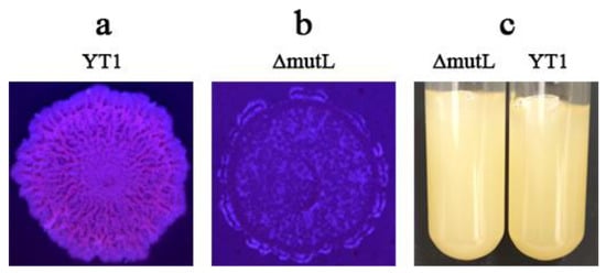 To conduct biofilm formation assays, both B. amyloliquefaciens YT1 and its MutL mutant were cultivated in MSgg medium [33,34], which is a formulation containing 5 mM potassium phosphate (pH 7), 100 mM Mops (pH 7), 2 mM MgCl2, 700 µM CaCl2, 50 µM MnCl2, 50 µM FeCl3, 1 µM ZnCl2, 2 µM thiamine, 0.5% glycerol, 0.5% glutamate, 50 µg/mL tryptophan, and 50 µg/mL phenylalanine, where antibiotics were incorporated as required at the following concentrations: 100 µg/mL ampicillin, 100 µg/mL spectinomycin, 20 µg/mL neomycin, and 5 µg/mL chloramphenicol, based on previous studies [35].