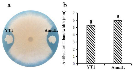On Petri dishes inoculated effectively with R. solani, both the WT YT1 and the mutant ΔmutL were able to consistently form normal and relatively fixed antibacterial zones after 24–72 h of confrontation cultivation. The fungal mycelium of the pathogen was unable to cross this antibacterial zone and continue its expansion, exhibiting an upward growth pattern of the mycelium. No significant difference in the size of the antibacterial zones was observed between the two strains (Figure 3).