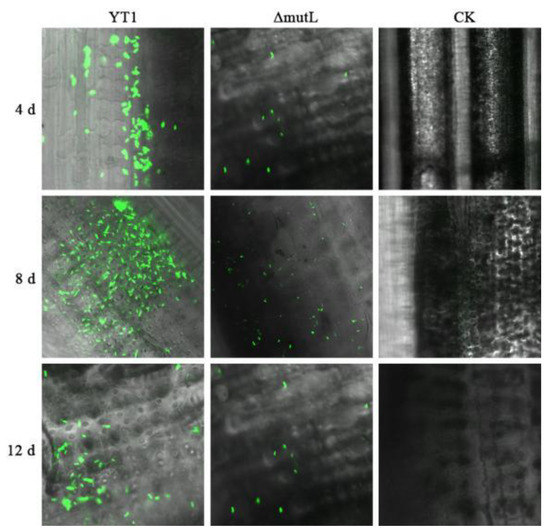 This study utilized GFP-labeling technology to observe the colonization of B. amyloliquefaciens YT1 and mutant ΔmutL on rice straw inoculated with R. solani (Figure 4). Although the number of both strains consistently showed a decreasing trend between the first and twelfth days, there was a significant difference in their performances. On day 8, B. amyloliquefaciens YT1 exhibited a distinct aggregation effect at the site of infection, inhibiting the spread of the pathogenic fungus, whereas the mutant ΔmutL never showed a clear aggregation effect. From the eighth day to the twelfth day, as the number of organisms decreased sharply, the colonization capacity of both strains also decreased.
