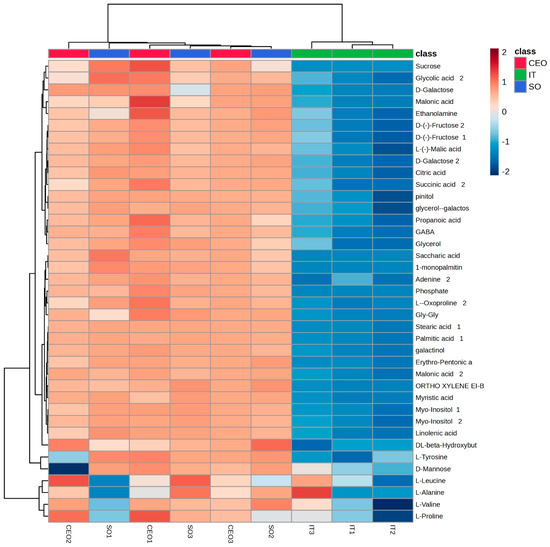 Heatmap generated using Euclidean distance for metabolite clustering with significant differences between groups (p < 0.05). The columns represent the samples from each treatment (green = industrial treatment; blue = soybean oil; red = CEO). Each line represents a metabolite. The colored squares (heat map) represent the abundance of metabolites, where dark red is the highest abundance and dark blue is the lowest.