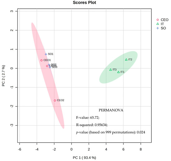 Multivariate principal component analysis (PCA) and PERMANOVA test of metabolic profiles found in soybean leaf extracts whose seeds were subjected to CEO, soybean oil, and industrial treatment.