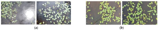 The environment of Brasenia schreberi harvesting is dominated by open ponds and lakes, and water surface reflections brought about by changes in sunlight are a common interfering factor in this environment (as shown in Figure 1a), which sometimes affects the quality of the images acquired by the camera and increases the difficulty of target recognition.