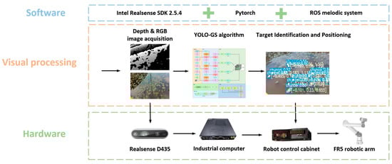 - Software part: The software used is based on Ubuntu 18.04 system (Canonical Group Ltd., London, UK), covering the depth camera software Intel Realsense SDK (Intel Corp, Santa Clara, CA, USA), ROS system (Open Robotics, Mountain View, CA, USA), and the YOLO-GS target recognition algorithm based on PyTorch deep learning framework (Facebook, Menlo Park, CA, USA);