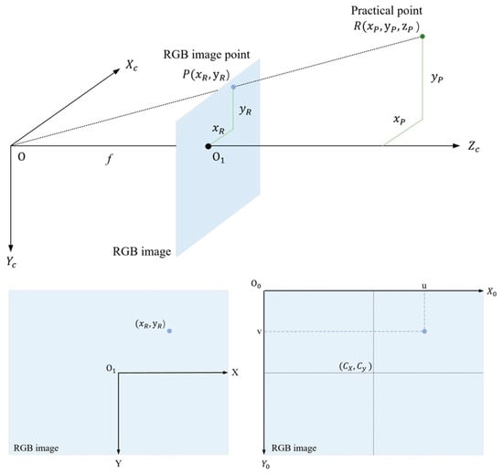 Since pixel information is necessary for aligning the depth map and RGB map, the image pixel coordinate system is established with the upper left corner of the image plane as the origin , as depicted in Figure 4. and are, respectively, parallel to the X-axis and Y-axis of the image physical coordinate system. The coordinates of the origin in the image physical coordinate system are in the pixel coordinate system, and the physical dimensions of each pixel in the X- and Y-axis directions in the image physical coordinate system are and respectively. Based on the derived Equations (1) and (2), the coordinates of the corresponding point of R point in the image pixel coordinate system are presented in Equations (3) and (4):