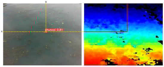 As illustrated in Figure 4, following the previously introduced 3D picking-point positioning principle, the 3D-point coordinates in the camera coordinate system are initially mapped to the imaging plane. Subsequently, the RGB image and depth image are proportionally aligned. The center point of the predicted box in the RGB image corresponds to the coordinate point in the depth image. Ultimately, the depth value of this point is retrieved, allowing for the determination of the depth value of the actual 3D point.