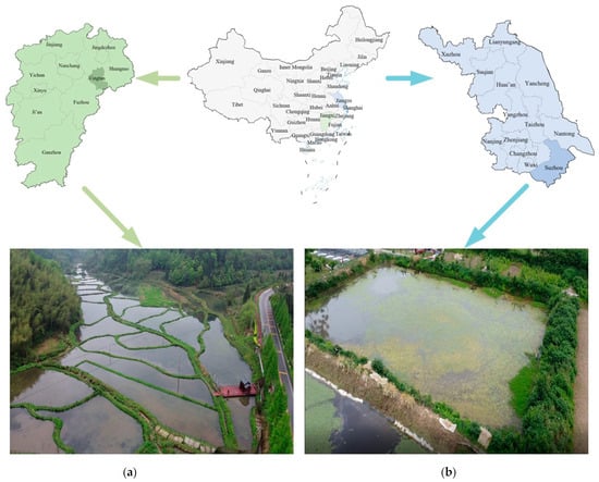 Complex actual operation scene. (a) Brasenia schreberi planting base in Yingtan, Jiangxi Province; (b) Brasenia schreberi experimental base in Suzhou, Jiangsu Province.