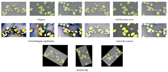 Randomly select the original image data for random flipping, local clipping, length and width scaling, color histogram equalization [40], and median filtering [41], adding Gaussian noise [42], salt and pepper noise, and other operations. According to the previous analysis, the light change factor greatly interferes with target recognition, so the light adaptability of some original data is enhanced by adjusting the contrast and color difference [43]. Increase the data set to 2000 under a series of data enhancement operations. The image enhancement effect is shown in Figure 7. After removing samples with poor image quality through manual screening, the final data set is controlled at 1500 images.