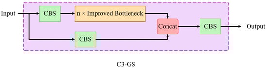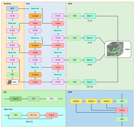 Based on YOLOv5s, a new lightweight network named YOLO-GS was proposed. The architecture of YOLO-GS is shown in Figure 8. The model also consists of three main parts: the backbone, the neck, and the detection head.