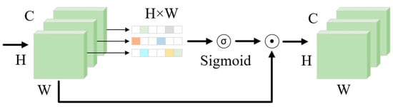 The overall structure of simAM is shown in Figure 10. The input feature map is first weighted by the simAM attention mechanism and then normalized by the sigmoid function. The resulting weight is multiplied by the original feature map element by element and, finally, output.