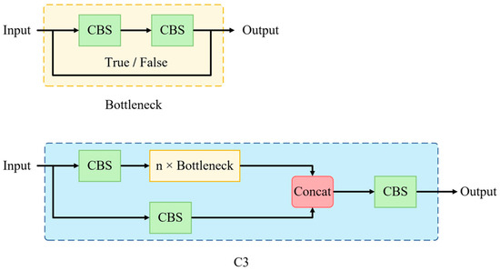 The original C3 structure is depicted in Figure 11 and comprises two branches. One branch traverses a CBS layer and n stacked bottleneck layers. The bottleneck module determines whether to use the residual structure according to the incoming parameters. The other branch solely goes through a CBS layer. Subsequently, the two branches are merged and pass through another CBS layer to yield the final output.