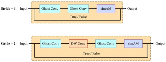 For the purpose of reducing the number of parameters, we use the Ghost bottleneck structure for reference. Considering that the original Ghost bottleneck adopted the network structure of DW convolution and Ghost Conv in series, although it can effectively reduce the number of parameters and calculation, the feature extraction ability is not outstanding, so we chose to embed the simAM attention mechanism in its main path to enhance its ability to learn important features. The improved bottleneck structure is shown in Figure 12.