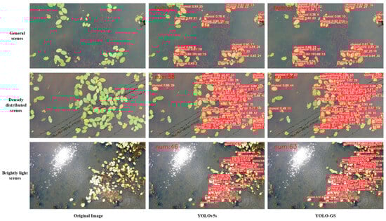 - The growth density of Brasenia schreberi is high, with frequent overlapping occlusion, resulting in the loss of some target information and occasional missing detection. It is essential to enhance the feature extraction capability of the target recognition algorithm to decrease the missing detection rate.