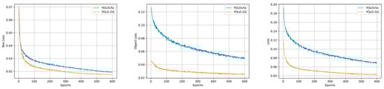 Figure 16 shows the loss function curve of the original YOLOv5s and YOLO-GS in the training process. It can be seen that at the beginning of the training, the gradient of the loss function decreases rapidly. When the iteration rounds reach 200, the gradient of the loss function continues to decline, but the trend gradually slows down. Until 600 rounds of iteration are completed, the curve has tended to be stable, and the loss function converges to a fixed value, ending the training. During this process, the loss function did not show overfitting. Compared with the original YOLOv5s, YOLO-GS with the Focal EIoU loss function has a faster overall convergence speed, lower training loss values, and smaller fluctuations in the loss values. The final box loss, object loss, and total loss of YOLOv5s are 0.019, 0.048, and 0.067, respectively, while the final loss values of YOLO-GS are 0.017, 0.025, and 0.042, respectively, which are reduced to a certain extent compared with YOLOv5s, verifying that the predictive ability of the model is enhanced.